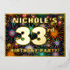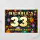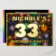 The front of this eye-catching and upbeat thirty-third birthday celebration foil invitation card design features a personalised name, a large number “33rd”, the message “BIRTHDAY PARTY!”, and a border. The background of the front features a vibrant, colourful pattern inspired by bursting celebratory fireworks. The back features personalised details about the event, such as the date, time, place/venue, and any other important information. Customised invitations like these might be a fun way to invite guests to a birthday gathering being held to celebrate somebody’s 33rd birthday. [~Z0000602]