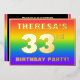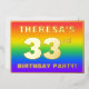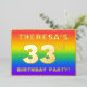 The front of this exciting thirty-third birthday party foil invitation card design features an editable name, a large number “33rd”, the message “BIRTHDAY PARTY!”, and a border. The background of the front features a joyful, multicolored, rainbow spectrum inspired gradient pattern. The back features personalised details about the event, such as the date, time, place/venue, and any other information that may be important. Customised invitations like these might be a fun way to invite guests/attendees to a birthday gathering being held to honour somebody’s 33rd birthday. [~Z0000599]