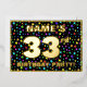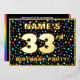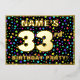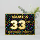 The front of this upbeat thirty-third birthday party foil invitation card design features a custom name, a large number “33rd”, the message “BIRTHDAY PARTY!”, and a border. The background of the front has a joyful, multicolored pattern of star shapes. The back features personalised details about the event, such as the date, time, place, and any other information that may be important. Personalised invitations like these might be a fun way to invite guests to a birthday party/gathering being held in celebration of somebody’s 33rd birthday. [~Z0000600]