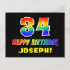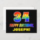The front of this fun, cheerful, and colourful birthday postcard design features a large number "34" and the message "HAPPY BIRTHDAY,", both coloured with a rainbow spectrum gradient inspired pattern, along with a bold yellow custom recipient name. The front also has a simple, plain, black coloured background. The back of the postcard features a personalised birthday greeting message, or could perhaps be cleared and left blank if a message is to be written by hand instead. A vibrant personalised birthday postcard like this might be a fun way to acknowledge somebody’s thirty fourth birthday. [~Z0000474]