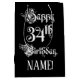 This elegant and ornate birthday themed giftbag design features the message “Happy 34th Birthday,” in formal script style text, on a black coloured background. It also has a personalised recipient name. An opulent gift-bag like this might be a respectable way of wrapping a birthday present or gift being given to somebody who is celebrating their 34th birthday. [~Z0000557]