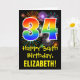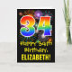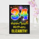 The front of this colorful, fun, and exciting birthday greeting card design features a large number "34" having a rainbow spectrum gradient inspired pattern. It also features the message "Happy 34th Birthday,", and an editable recipient name. The front additionally features a colorful background pattern inspired by bursting celebratory fireworks. The inside features a custom birthday greeting message, or could perhaps be cleared and left blank if a message is to be written by hand instead. A customizable birthday card like this might be a fun way to send a message celebrating somebody’s thirty-fourth birthday. [~Z0000442]