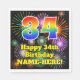 This fun and joyful birthday-themed paper napkin design features a large number “34” with a colourful rainbow spectrum gradient inspired pattern, along with the message “Happy 34th Birthday,”, and a custom name. The background features a vibrant and colourful pattern inspired by bursting celebratory fireworks. Colourful birthday themed paper napkins like this might be used at a party in celebration of somebody’s thirty fourth birthday. [~Z0000574]
