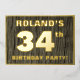 The front of this bold thirty-fourth birthday celebration/party foil invitation card features a customisable name, a large number “34th”, the message “BIRTHDAY PARTY!”, and a border, all in foil. There is a rustic, yet sophisticated, faux wood grain look inspired pattern for the background of the front. The back features personalised details about the event, such as the date, time, venue/place, and any other important information. Personalised invitations like these might be used to invite guests/attendees to a birthday gathering/party being held to celebrate somebody’s 34th birthday. [~Z0000598]