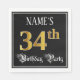 This opulent and fancy birthday themed paper napkin design features a personalized name and the message “34th Birthday Party”. The large number “34th” has a faux/imitation gold-inspired coloring pattern, and the words “Birthday Party” are in luxurious script-style text. The background is colored black by default (although it can be customized). Elegant, luxurious paper napkins like this might be useful at a birthday celebration being held to celebrate somebody’s 34th birthday. [~Z0000565]