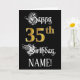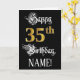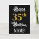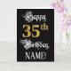 The front of this luxurious and elaborate birthday greeting card design features the message “Happy 35th Birthday,”, along with a personalised recipient name. Some of the message is in an opulent script-style text. The large number “35th” features a faux/imitation gold-inspired look pattern. The background is coloured black. The inside has a custom birthday greeting message, or could perhaps be cleared and left blank if a message is to be written by hand instead. An elegant, editable birthday greeting card like this might be used to celebrate somebody’s thirty-fifth birthday. [~Z0000559]