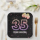 Party balloons and confetti on black background with the neon number 35 for a 35th birthday party.