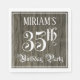 This elaborate and fancy birthday-themed paper napkin design features a personalised name and the message “35th Birthday Party”. The large number “35th” and the words “Birthday Party” are in ornate script-style text. The background has a faux/imitation woodgrain-inspired pattern. Ornate, luxurious paper napkins like this might be used at a birthday party/celebration being held in celebration of somebody’s thirty fifth birthday. [~Z0000564]