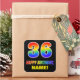 This fun, cheerful, and colourful birthday sticker design features a large number "36" and the message "HAPPY BIRTHDAY,", both having a rainbow spectrum gradient inspired pattern colouring, along with a bold yellow editable name. The background is coloured black. Fun stickers like this might be used when wrapping a birthday present or gift being given to somebody who is celebrating their 36th birthday, or perhaps might be given out to the guests at a birthday party. [~Z0000480]