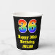 This colourful and fun birthday themed paper cup design features a large number “36” having a rainbow spectrum gradient inspired pattern. It also features the message “Happy 36th Birthday,”, and a customisable name. It also has a black-coloured background. Vibrant, colourful paper cups like this might be fun to use at a birthday celebration/party being held to celebrate somebody’s thirty sixth birthday. [~Z0000537]