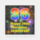 This cheerful and joyful birthday themed paper napkin design features a large number “36” with a colorful rainbow spectrum gradient inspired pattern, along with the message “Happy 36th Birthday,”, and a personalized name. The background features a multicolored bursting celebratory fireworks inspired pattern. Vibrant birthday themed paper napkins like this might be used at a birthday party celebrating somebody’s 36th birthday. [~Z0000574]