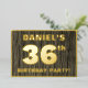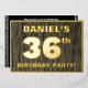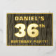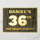 The front of this bold thirty-sixth birthday celebration foil invitation card features an editable name, a large number “36th”, the message “BIRTHDAY PARTY!”, and a border, all in foil. There is a rustic, yet elegant, faux wood grain look inspired pattern for the background of the front. The back features personalised details about the event, such as the date, time, venue, and any other useful information. Customisable invitations like these might be used to invite guests/attendees to a birthday party/gathering being held to honour somebody’s 36th birthday. [~Z0000598]