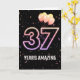 Party balloons and confetti on black background with the neon number 37 for a 37th birthday.