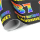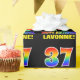 This cheerful, colourful, and fun birthday wrapping paper design features a large number "37" and the message "HAPPY BIRTHDAY,", both coloured with a rainbow spectrum gradient inspired pattern, along with a bold yellow custom recipient name. The background is coloured black. Fun birthday themed wrapping paper like this might be used when giving a gift or present in celebration of somebody’s thirty seventh birthday. [~Z0000475]