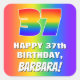 This fun and vibrant birthday square sticker design features a large number “37” with a colourful rainbow spectrum inspired gradient pattern, along with the message “HAPPY 37th BIRTHDAY,”, and a personalised recipient name. The background also features an exciting multicolored rainbow spectrum inspired gradient pattern. Cheerful, fun, personalised stickers like this might be given as a birthday present, or used while wrapping presents, or perhaps used as birthday party decorations when celebrating somebody’s thirty seventh birthday. [~Z0000571]