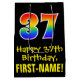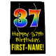This colourful, fun, and exciting birthday-themed gift bag design features a large number "37" with a rainbow spectrum gradient inspired pattern, along with the message "Happy 37th Birthday,", and a personalised recipient name. The background is coloured black. A fun gift bag like this might be used when wrapping presents being given to somebody in celebration of their thirty seventh birthday. [~Z0000512]