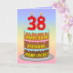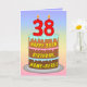 This colourful and joyful birthday greeting card design features a cartoon-style depiction of a three-tier birthday cake having numeral-shaped candles on top showing the number “38“, along with the message “HAPPY 38TH BIRTHDAY,”, and a personalised recipient name. The background of the front has a multicolored pastel rainbow spectrum inspired gradient pattern. The inside has a customised birthday greeting message, or could perhaps be cleared and left blank if a message is to be written by hand instead. An upbeat, editable birthday greeting card like this might be sent to celebrate somebody’s thirty-eighth birthday. [~Z0000625]