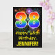 The front of this fun, colorful, and exciting birthday-themed greeting card design features a large number "38" having a rainbow spectrum gradient inspired pattern. It also features the message "Happy 38th Birthday,", and an editable recipient name. The front additionally has a colorful background pattern inspired by the look of bursting celebratory fireworks. The inside features a custom birthday greeting message, or could perhaps be cleared and left blank if a message is to be written by hand instead. A customizable birthday card like this might be a fun way to celebrate somebody’s thirty eighth birthday. [~Z0000442]
