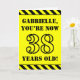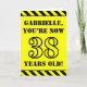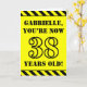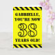The front of this bold and attention-grabbing birthday themed greeting card design features a personalized name and the message "YOU’RE NOW 38 YEARS OLD!" in black stencil style text on a yellow colored background. The front also features an eye-catching yellow and black striped pattern at the top and bottom edges. The inside features a customized birthday greeting message, or could perhaps be cleared and left blank if a message is to be written by hand instead. A personalized birthday card like this might be a fun way to send birthday wishes to somebody who is celebrating their thirty eighth birthday. [~Z0000413]