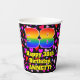 This happy and fun birthday themed paper cup design features a large number “38” having a rainbow spectrum gradient inspired pattern. It also features the message “Happy 38th Birthday,”, and a custom name. The background features a pattern of heart shapes with colours like purple, red, and pink. Fun, joyful paper cups like this might be fun to have at a birthday party/celebration being held in celebration of somebody’s 38th birthday. [~Z0000548]
