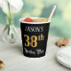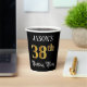 This opulent and fancy birthday paper cup design features a custom name and the message “38th Birthday Party”. The large number “38th” has an imitation/faux gold-inspired colouring pattern, and the words “Birthday Party” are in ornate script-style text. The background is coloured black by default (although it can be customised). Ornate, elegant paper cups like this might be useful at a birthday celebration/party being held to honour somebody’s thirty eighth birthday. [~Z0000567]