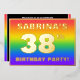 The front of this eye-catching thirty-eighth birthday celebration/party foil invitation card design features a personalised name, a large number “38th”, the message “BIRTHDAY PARTY!”, and a border. The background of the front has a vibrant, multicolored, rainbow spectrum inspired gradient pattern. The back features personalised details about the event, such as the date, time, place/venue, and any other relevant information. Personalised invitations like these might be a fun way to invite attendees to a birthday party/gathering being held to honour somebody’s 38th birthday. [~Z0000599]