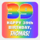 This cheerful and vibrant birthday square sticker design features a large number “39” having a colourful rainbow spectrum inspired gradient pattern. It also features the message “HAPPY 39th BIRTHDAY,”, and a customisable recipient name. The background also features a fun multicolored rainbow spectrum inspired gradient pattern. Fun, personalised stickers like this might be given as a birthday gift, or used while wrapping gifts, or perhaps used as a birthday party decoration when celebrating somebody’s thirty ninth birthday. [~Z0000571]