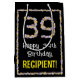 This fun, nature-inspired birthday-themed giftbag design features the message “Happy 39th Birthday,” along with a personalised recipient name. The large number “39” plus the border both feature flower icons. A birthday themed gift bag like this might be a fun way to wrap a present or gift being given to celebrate somebody’s thirty-ninth birthday. [~Z0000653]