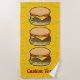 Cheeseburger icon. Junk food outline icons yellow pattern background. Custom text.