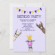 A birthday party invitation with a cute graphic illustration featuring 3 curious llamas. One llama is wearing a crown and blowing bubble gum. The other 2 are standing off to the side, with only their head and necks visible, peering over at you. Purple and yellow bunting banner. Light purple background.