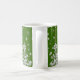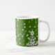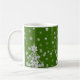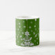 Drink your coffee, tea or hot chocolate in festive style from this classic ceramic mug featuring a white Christmas tree ornament and snowflakes over a green background. Make it a holiday gift or decorate with it.