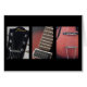 3 Part Harmony is a triptych featuring three close up colour photographic images of different components of an old Framus hollow body electric jazz guitar. The first frame features the black headstock and machine heads where the strings can be tightened and tuned. The Framus logo is also in this image. The second frame shows a of the magnetic pickup which is black with a white metal framing it. Part of the guitar neck is visible which is a dark brown and some of the frets are also visible as is