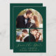 This simple, minimalist Save the Date card features a 3-photo collage arch above the words "Save the Date" in elegant gold-coloured handwriting script, followed by the couple's names, wedding date and city in sans serif font on an emerald green background. Add a more detailed message with additional information on the back, along with a QR code to help your guests visit your wedding website.