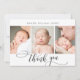 Simple Modern Elegant Calligraphy Script 3 Photo Collage Newborn Baby Thank You Birth Announcement Card. Features a beautiful "thank you" text in a hand lettered typography or calligraphy swash tail font script. Great for baby boy or baby girl. Pre-made personal message and birth statistics with baby's name are included in black and white. Easy to personalise with your baby photo and details.