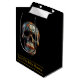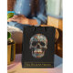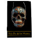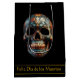 Present your gifts with captivating artistry using this striking gift bag featuring the detailed 3D Day of the Dead skull design. The design showcases a black base, richly adorned with vibrant and intricate floral and scroll patterns in contrasting metallic gold, teal, and copper, embodying the spirit of Día de los Muertos. These traditional sugar skull decorations include stylised marigolds (cempasúchil), the iconic flower of Día de los Muertos, along with swirling vines and symbolic flourishes. The metallic accents give the skull a dimensional, almost embossed appearance, making these culturally significant details truly pop. Across the bag, a prominent banner provides a customisable text field, allowing you to add a recipient's name, a short message, or a festive greeting, making this gift bag a unique and memorable way to present your thoughtful presents.