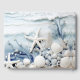 This modern lake house guest book features a 3D arrangement with sea stars, shells and water in blue and neutral tones and a custom beach house text with the year established.
