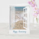 Beach hearts in the sand with frothy ocean surf and open window view for 3rd wedding anniversary