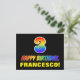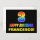 The front of this colourful, cheerful, and fun birthday themed postcard design features a large number "3" and the message "HAPPY BIRTHDAY,", both coloured with a rainbow spectrum gradient inspired pattern, along with a bold yellow editable recipient name. The front also features a simple black coloured background. The back of the postcard has a customisable birthday greeting message, or could perhaps be cleared and left blank if a message is to be written by hand instead. An exciting customisable birthday postcard like this might be a fun way of acknowledging somebody’s third birthday. [~Z0000474]