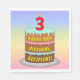 This upbeat and cheerful birthday-themed paper napkin design features a cartoon-style depiction of a three-tier birthday cake having a number-shaped candle on top showing the age “3“, along with the message “HAPPY 3RD BIRTHDAY,”, and a custom recipient name. The background has a multicolored pastel rainbow spectrum inspired gradient pattern. Paper napkins like these might be used when celebrating somebody’s 3rd birthday. [~Z0000623]