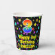 This joyful and colourful birthday-themed paper cup design features a large number “3” with a rainbow spectrum gradient inspired pattern, along with the message “Happy 3rd Birthday,”, and an editable name. The background features an exciting and colourful pattern having many star shapes with different sizes and colours. Vibrant, colourful paper cups like this might be fun to have at a birthday celebration being held to celebrate somebody’s third birthday. [~Z0000540]