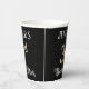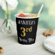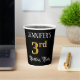 This ornate and opulent birthday paper cup design features a custom name and the message “3rd Birthday Party”. The large number “3rd” has an imitation/faux gold-inspired coloring pattern, and the words “Birthday Party” are in elegant script-style text. The background is colored black by default (although it can be customized). Fancy, elegant paper cups like this might be used at a birthday party being held in celebration of somebody’s third birthday. [~Z0000567]
