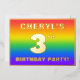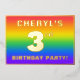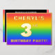 The front of this exciting and fun third birthday party/celebration foil invitation card design features a personalised name, a large number “3rd”, the message “BIRTHDAY PARTY!”, and a border. The background of the front has a vibrant, colourful, rainbow spectrum inspired gradient pattern. The back features personalised details about the event, such as the date, time, venue/location, and any other information that may be relevant. Personalised invitations like these might be a fun way to invite attendees to a birthday gathering/party being held to celebrate somebody’s 3rd birthday. [~Z0000599]
