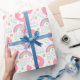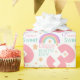 This 3rd birthday wrapping paper utilises the number 3 as the prominent design element. A rainbow and stars complete the purple, pink, peach and blue colour feel for a festive yet sweet look.