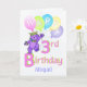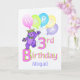 A purple teddy bear princess dressed up in a lovely yellow jewelled crown and pink, blue and green flowers is dancing on the Birthday B and holding a bunch of colourful balloons with the word HAPPY on them. This happy birthday card will bring a smile to a special girl on her 3rd birthday. Personalise with her name on card front and inside verse to make it extra special. Original design by Anura Design Studio.