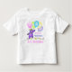 A shirt for the 3rd birthday party princess with custom name featuring a cuddly and cute purple teddy bear princess dressed up in a lovely yellow jewelled crown and pink, blue and green flower accessories holding a bunch of balloons with the word PARTY on them. Personalising with child's name makes it extra special. Original design by Anura Design Studio.