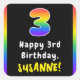 This cheerful and vibrant birthday-themed square sticker design features a large number “3“ having a vibrant rainbow spectrum inspired gradient pattern, along with the message “Happy 3rd Birthday,”, and an editable recipient name. Joyful stickers like these might be used or distributed at a birthday party held for somebody in celebration of their 3rd birthday, or perhaps used when preparing invitations or gifts/presents for such an event. [~Z0000630]