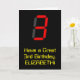The front of this silly and fun birthday themed greeting card design features a large number "3" having a red seven segment digital display style appearance, along with the message "Have a Great 3rd Birthday," and an editable name, on a black coloured background. The inside features a customisable birthday greeting message, or could perhaps be cleared and left blank if a message is to be written by hand instead. A customisable birthday card like this might be a fun way to acknowledge somebody’s third birthday. [~Z0000386]