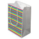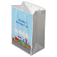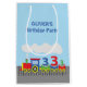 Our colourful 3rd birthday gift bag showcases a delightful and brightly coloured train carrying three number threes! The background is set in a sky blue. The back of the bag is a fun line pattern coordinating with the colours of the train. Customise with your own message, and name. Perfect as a party gift bag for each friend, or to put your own gift in!
