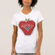 A shirt for third grade teachers featuring an illustration of a red apple decorated with a black heart with white polka dots and white text that says, "TEACHER." Red and black "3rd Grade, Third Grade..." text surrounds apple.