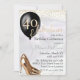 This custom invitation features a glamourous 40th birthday party theme on a white satin design background. A large black balloon is placed on the left with "40" printed in a gold foil design. The event information follows the "40 & fabulous" title. A pair of shiny looking gold high heel stilettos are pictured in the bottom left. Glamourous gold glitter confetti accents the top and bottom portions. It's perfect for a birthday, anniversary, or other special occasion.
